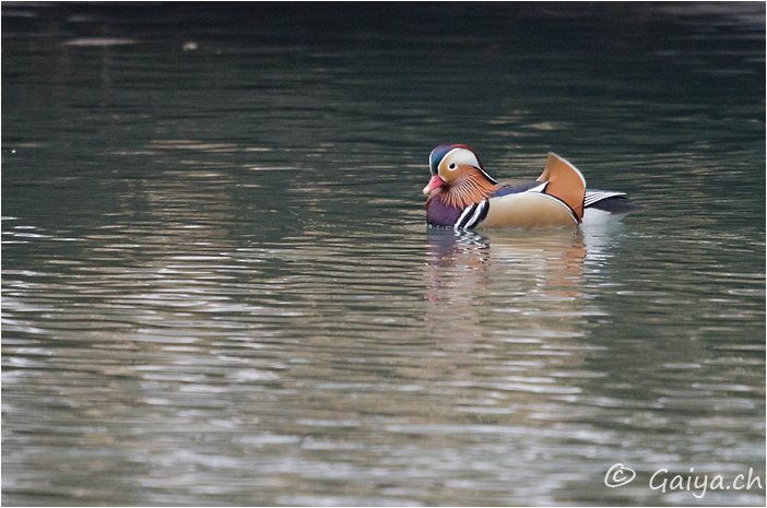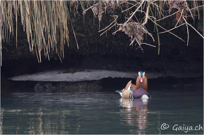 Mâle adulte Bords de l´Arve (GE), Février 2012 - Référence: 54- NIKON D7000, à 700 mm (1050 mm), f/6.3, 1/500 s, 1600 ISO Canard mandarinAix galericulata