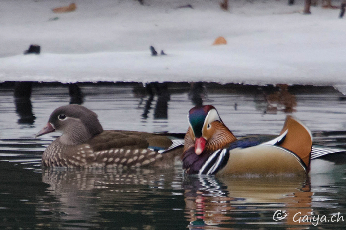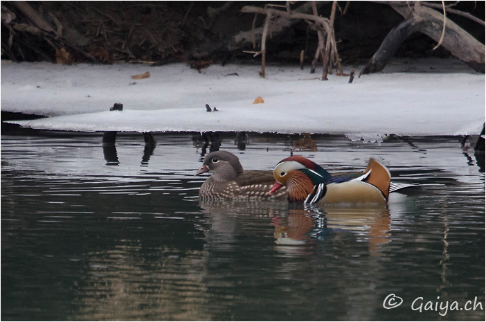 Mâle et femelle Bords de l´Arve (GE), Février 2012 - Référence: 55- NIKON D7000, à 700 mm (1050 mm), f/6.3, 1/500 s, 1600 ISO Canard mandarinAix galericulata