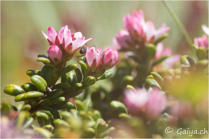 Azalée des Alpes Loiseleuria procumbensEricacées, 2-10 (cm), fleurit de juin à juillet, entre 1500 et 3000 (m), Peu fréquent,